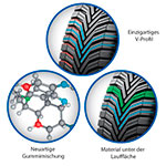 Протектор с V-образным направленным рисунком имеет самоблокирующиеся 3D-ламели, обуславливающие твёрдость на сухом асфальте, а также увеличивают тягу на снегу («эффект когтя»).