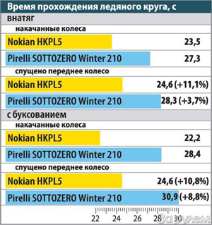На ледяном круге «Нокиан» тоже теряет больше, чем «Пирелли». Для «финна» потери составляют 11,1% на грани скольжения и 10,8% при буксовании. «Пирелли» более стабильна – медленнее всего на 3,7% при движении на грани скольжения, но зато на 8,8% с пробуксовкой.