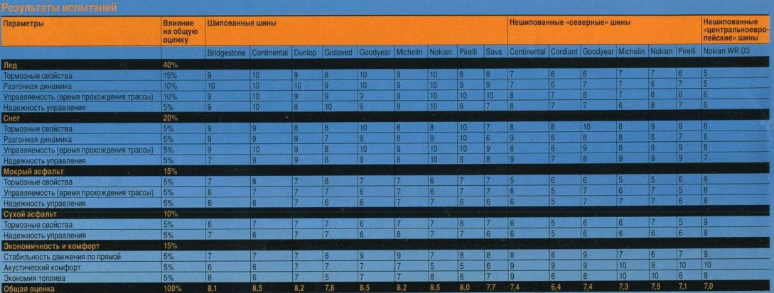 Естественно, в ледяных испытаниях «шиповки» превзошли своих бесшипованных конкурентов. На снежной поверхности наличие шипов уже не оказывало столь сильного влияния, поэтому результаты получились вперемешку. А вот что на мокром, что на сухом асфальтовом покрытии наблюдается перевес в пользу шипованной резины.