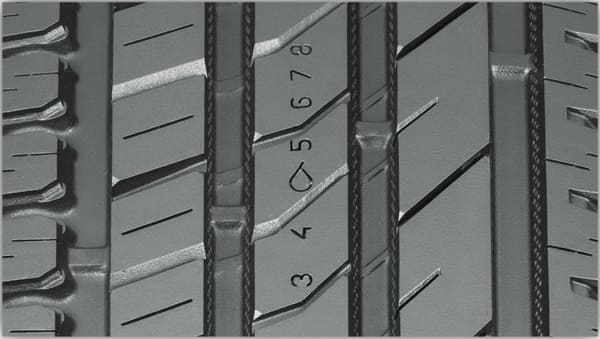 - Найдите индикатор покрышки: выступ-метка между блоков протектора или цифровой на самом протекторе. Если выступ-индикатор находится уже вровень с самим протектором, или стирается последняя цифра индикатора значит покрышка уже изношена и ее надо срочно заменить