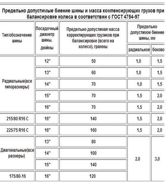 Существует стандарт ГОСТ 4754-97, который регламентирует максимальное количество балансировочных грузов на колесо, в зависимости от типоразмера шины. Несоблюдение этих стандартов является грубым нарушением, и в нормальных шиномонтажных центрах такое категорически не допускается. Например, при балансировке колеса с 14-дюймовой шиной 175/65 мастер может установить не более 70 г грузов на колесо. При этом боковое и радиальное биение после балансировки не должно превышать 1,5 и 1,0 мм соответственно.